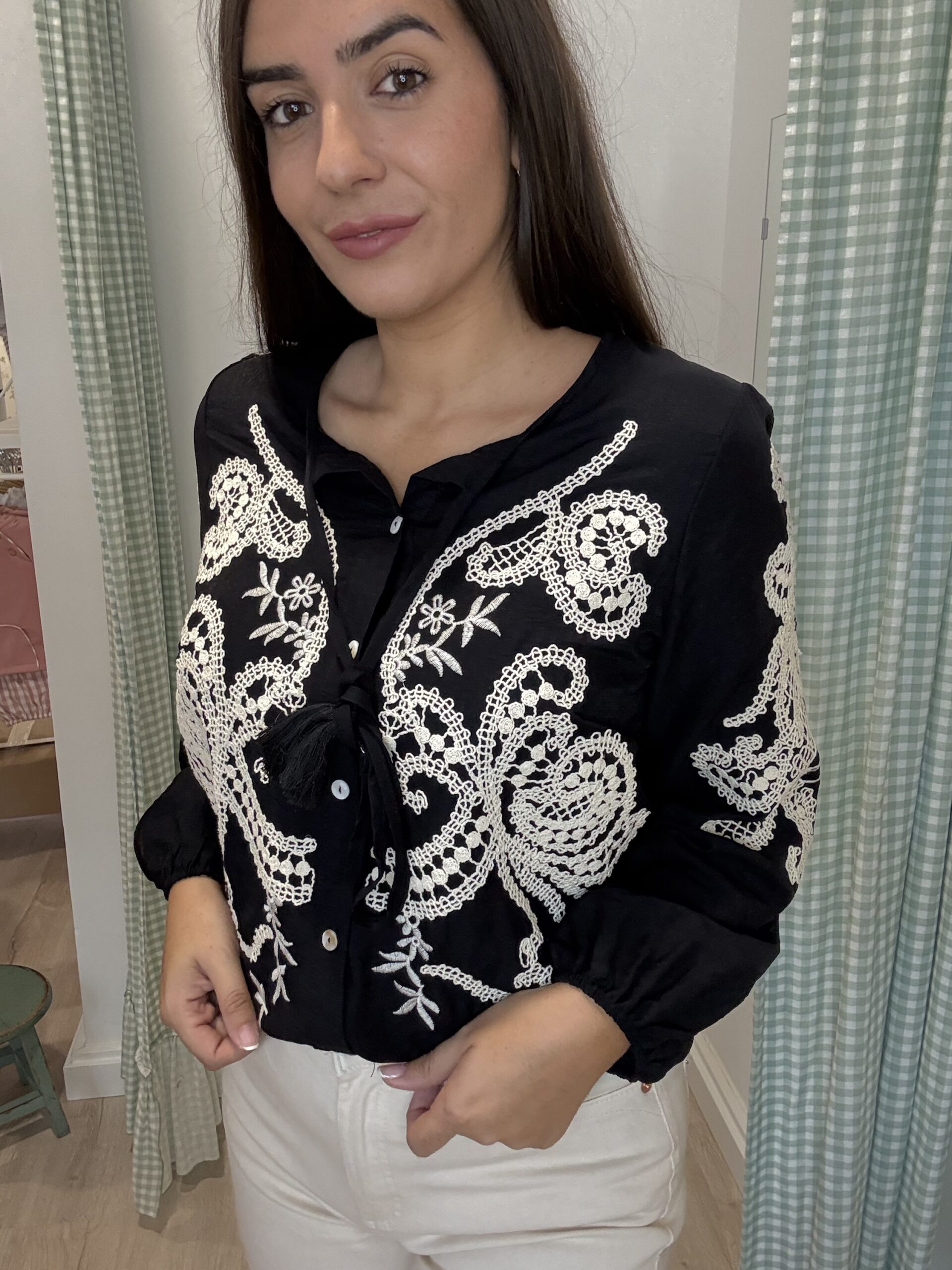 Blusa negra con botones delanteros y cierre con cordones y delalle de pompones para atar en el cuello. Manga con goma en muñeca y abullonada.