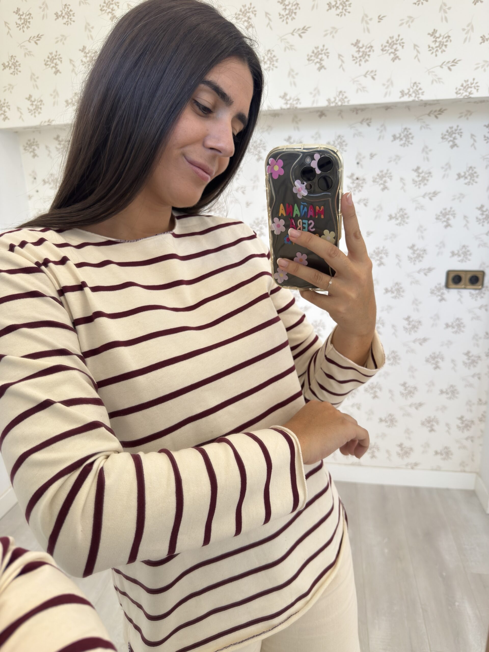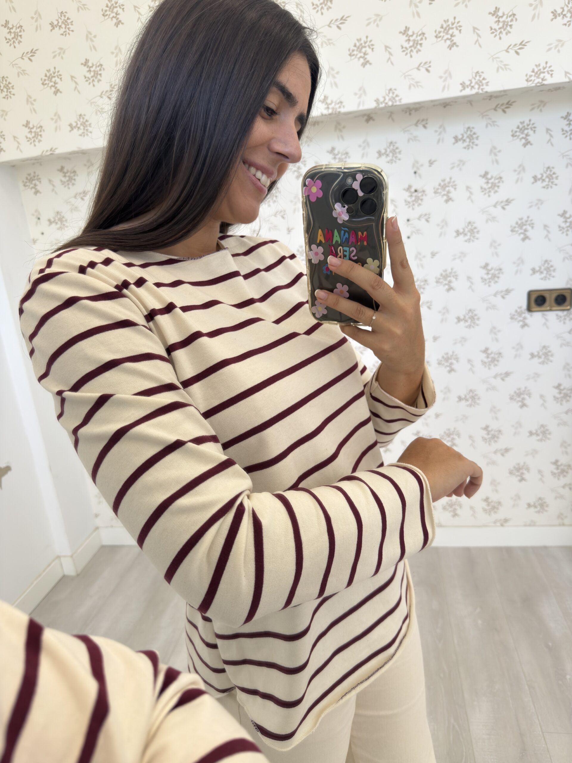 Camiseta de raya en color Crudo con rayas en Burdeos.