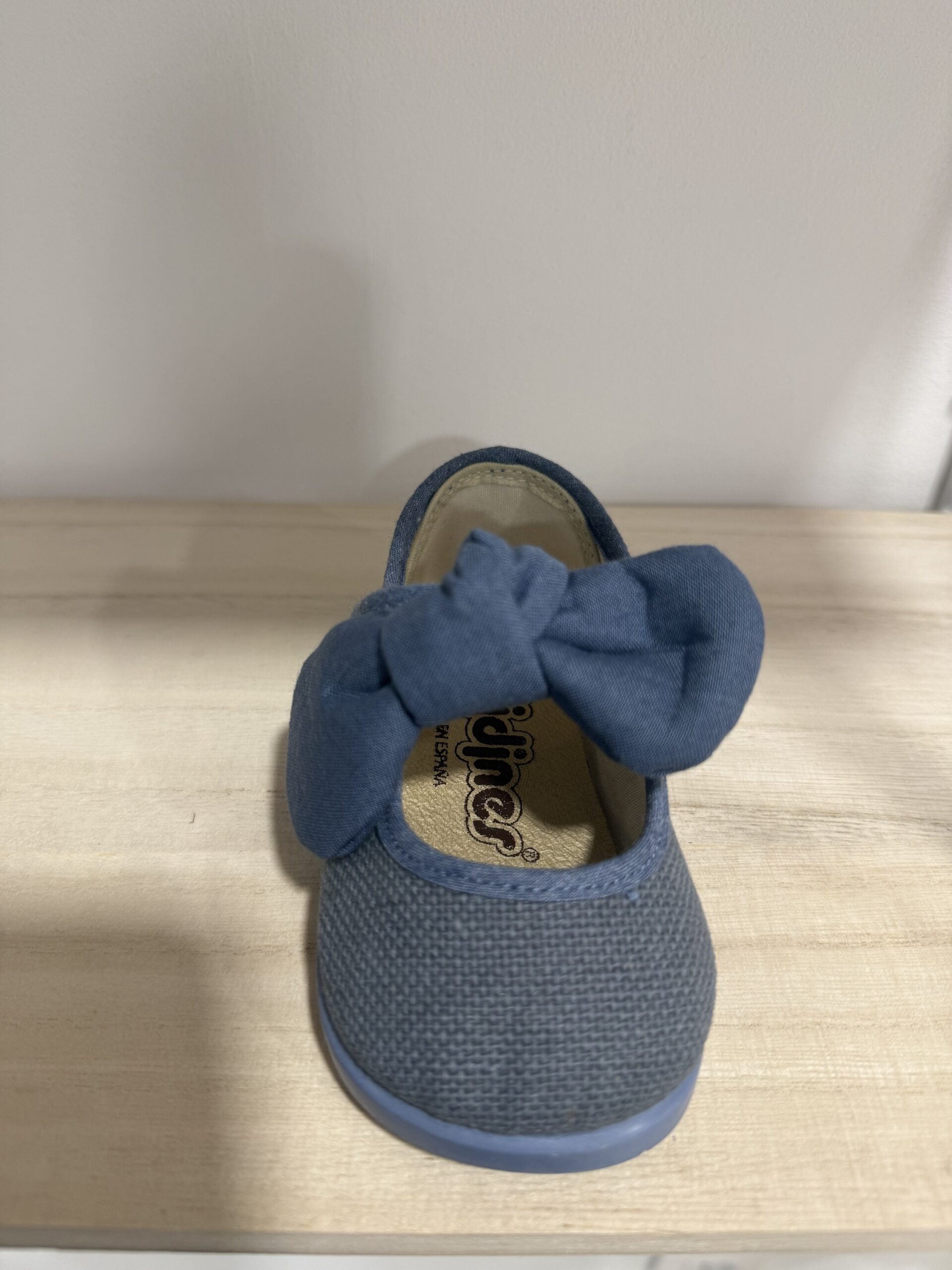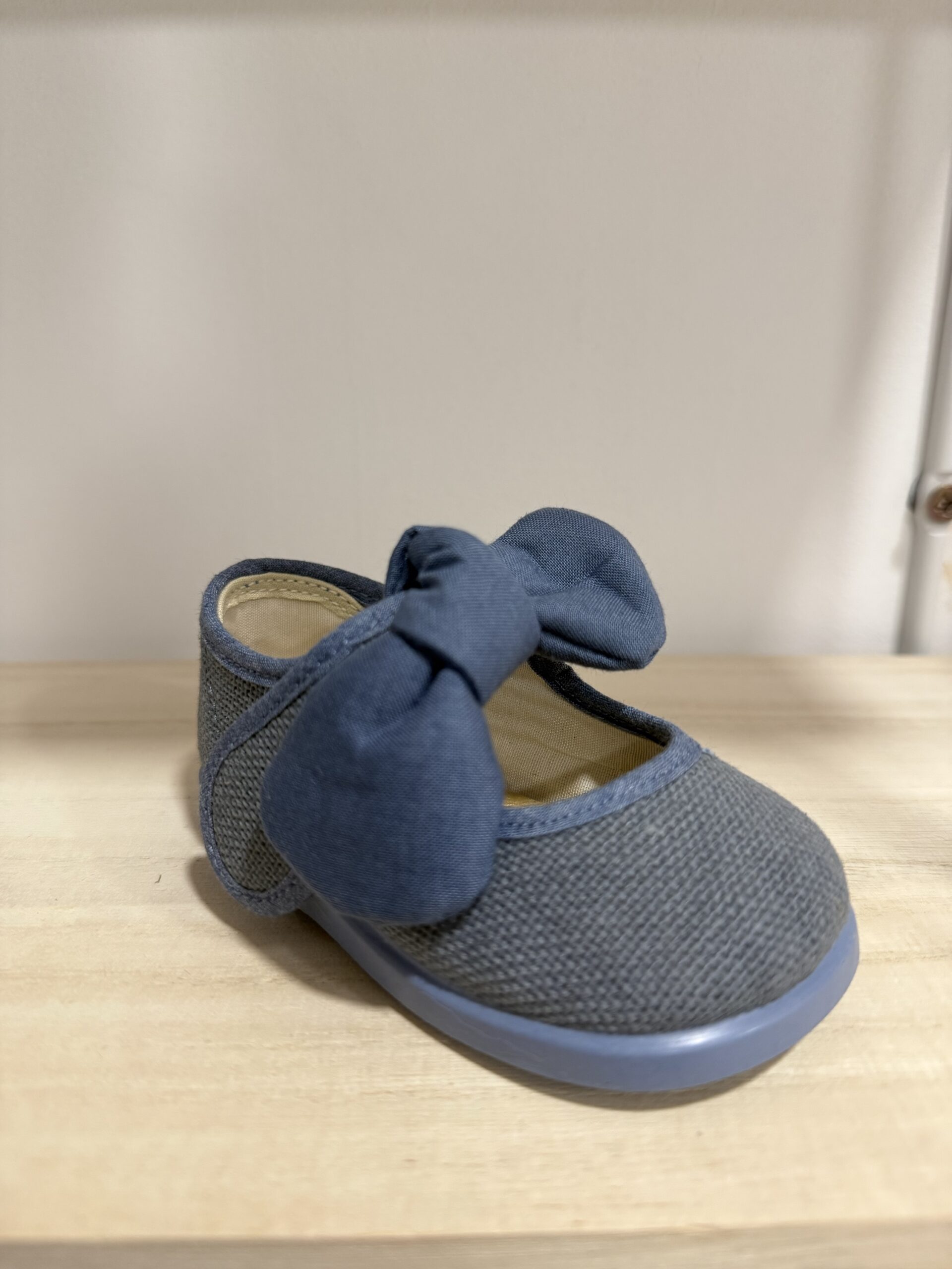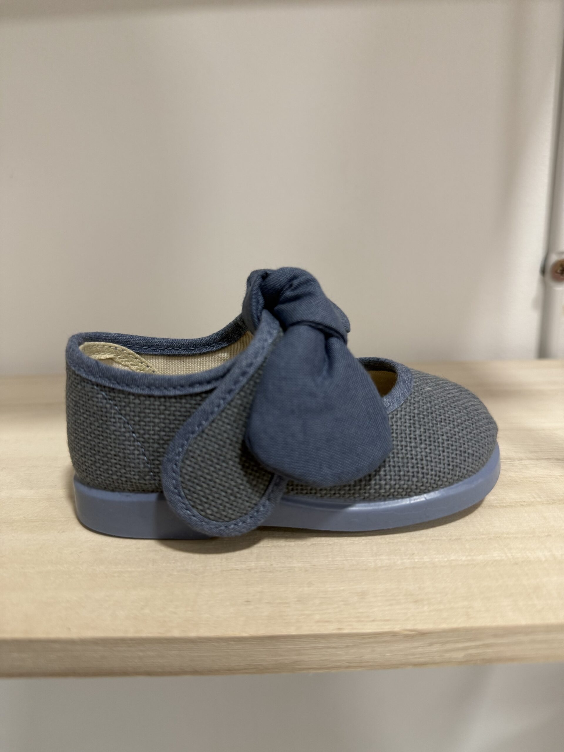 Merceditas de Lino con cierre de velcro y lazo que se puede sacar o poner.