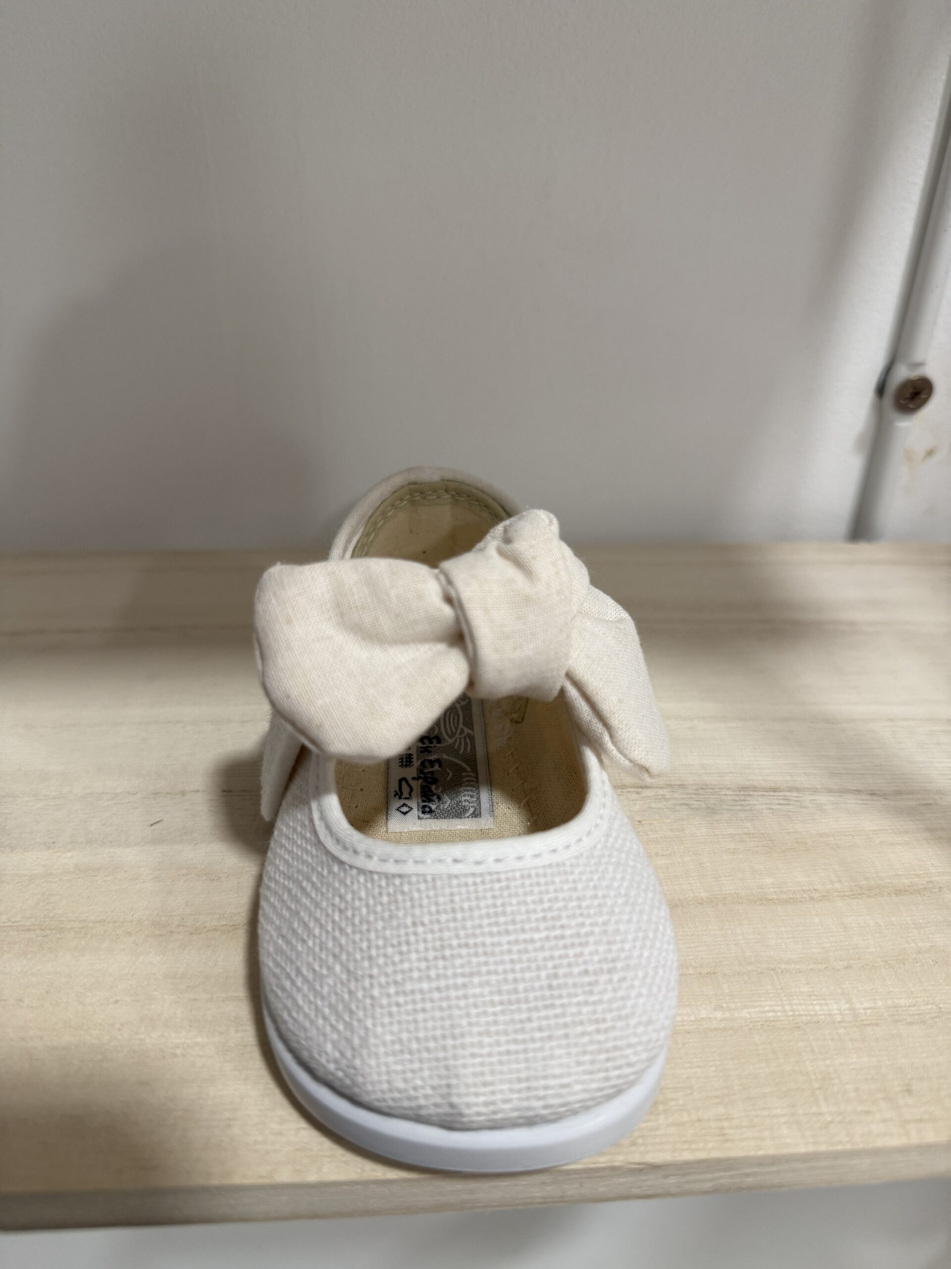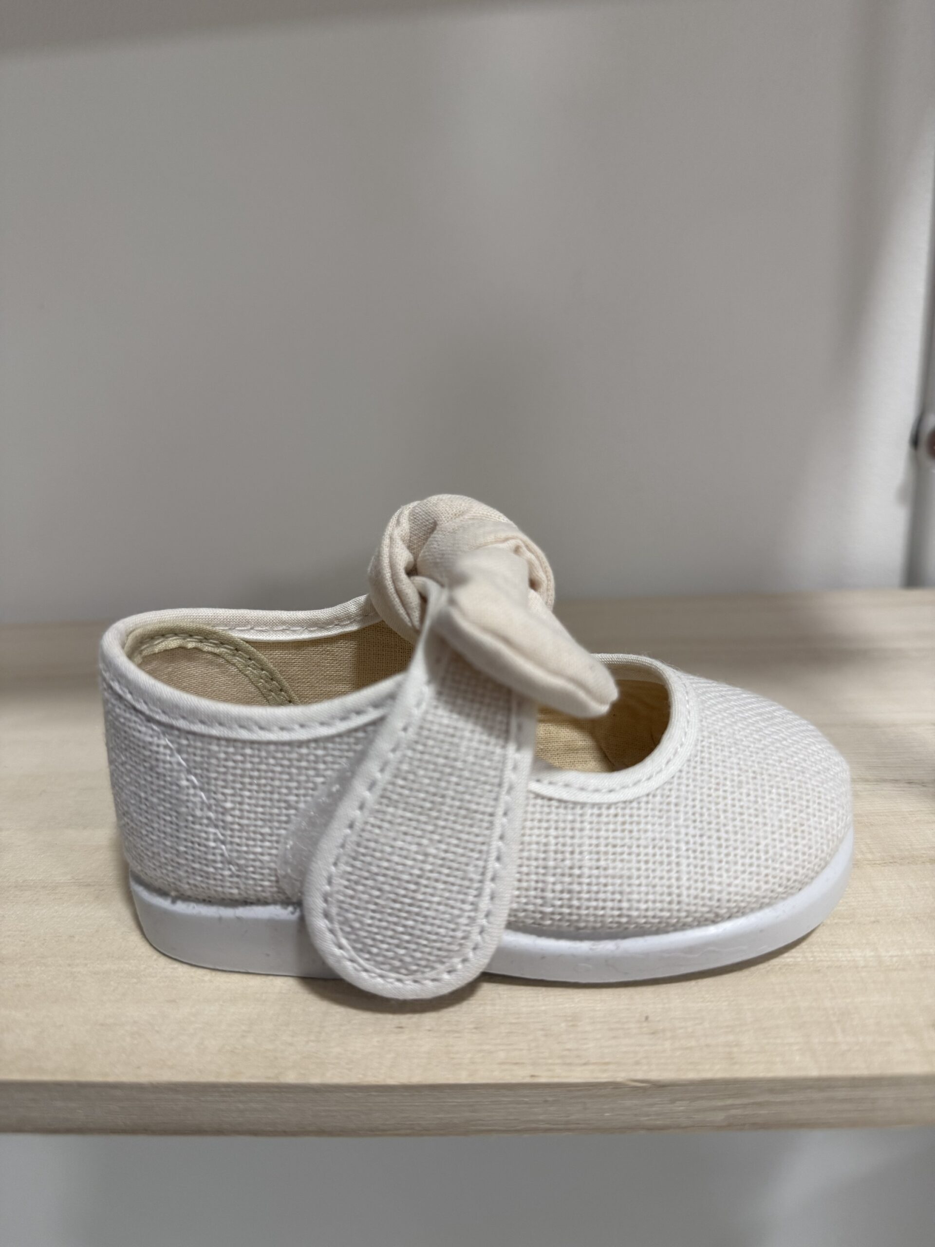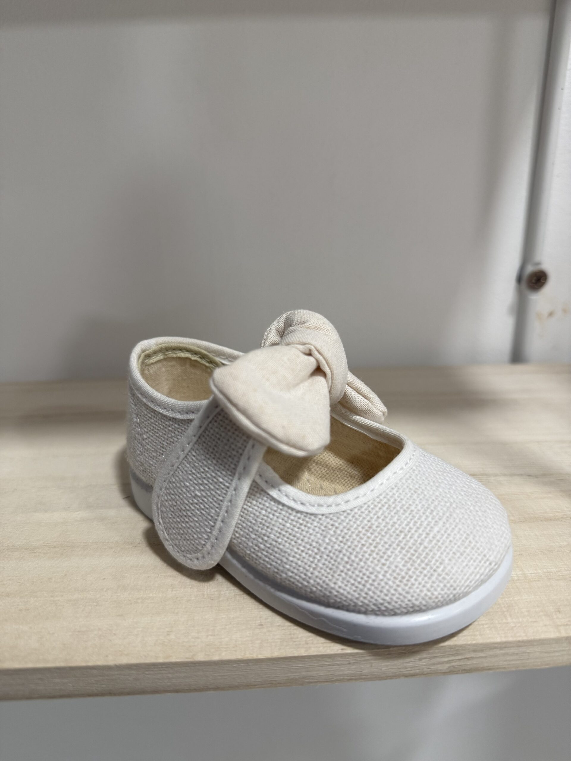 Merceditas de Lino con cierre de velcro y lazo que se puede sacar o poner.